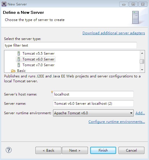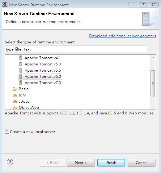 Servers 視圖目前沒有包含任何內容。此視圖針對的是應用程序和 Web 服務器;它讓您可以控制它們并監視其狀態。要從 IDE 直接控制 Tomcat,可通過從上下文敏感菜單選擇New > Server 來向 Tomcat 添加引用。下圖 所示的New Server 向導將默認指向剛剛創建的那個 Apache Tomcat V6.0 運行庫。