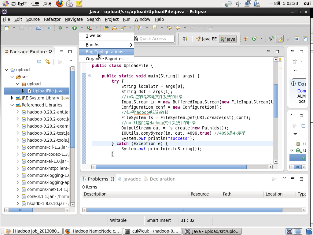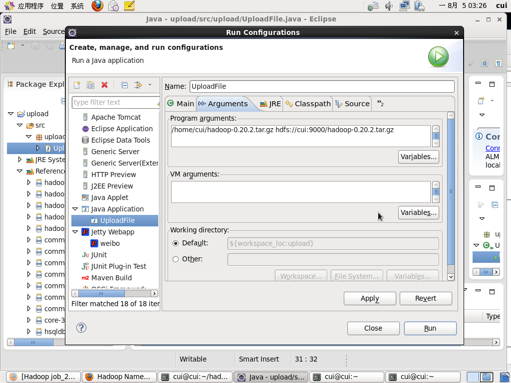 Arguments 加兩個參數/home/cui/xxxx hdf://cui:9000/xxx Applay Run