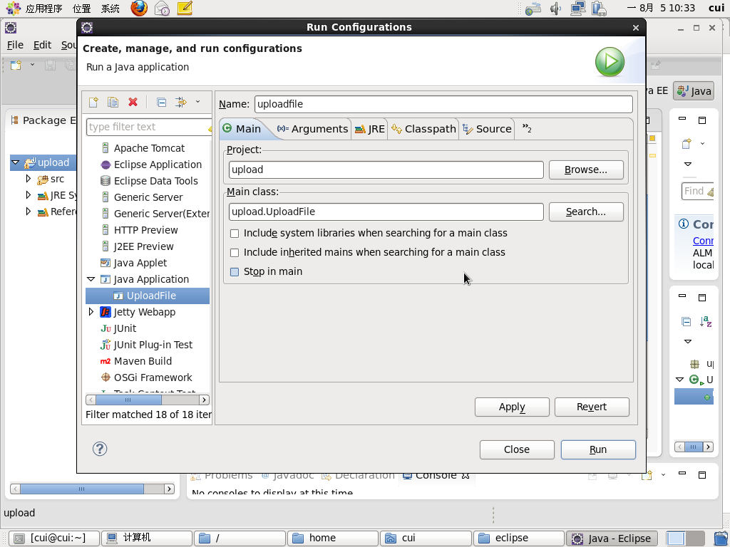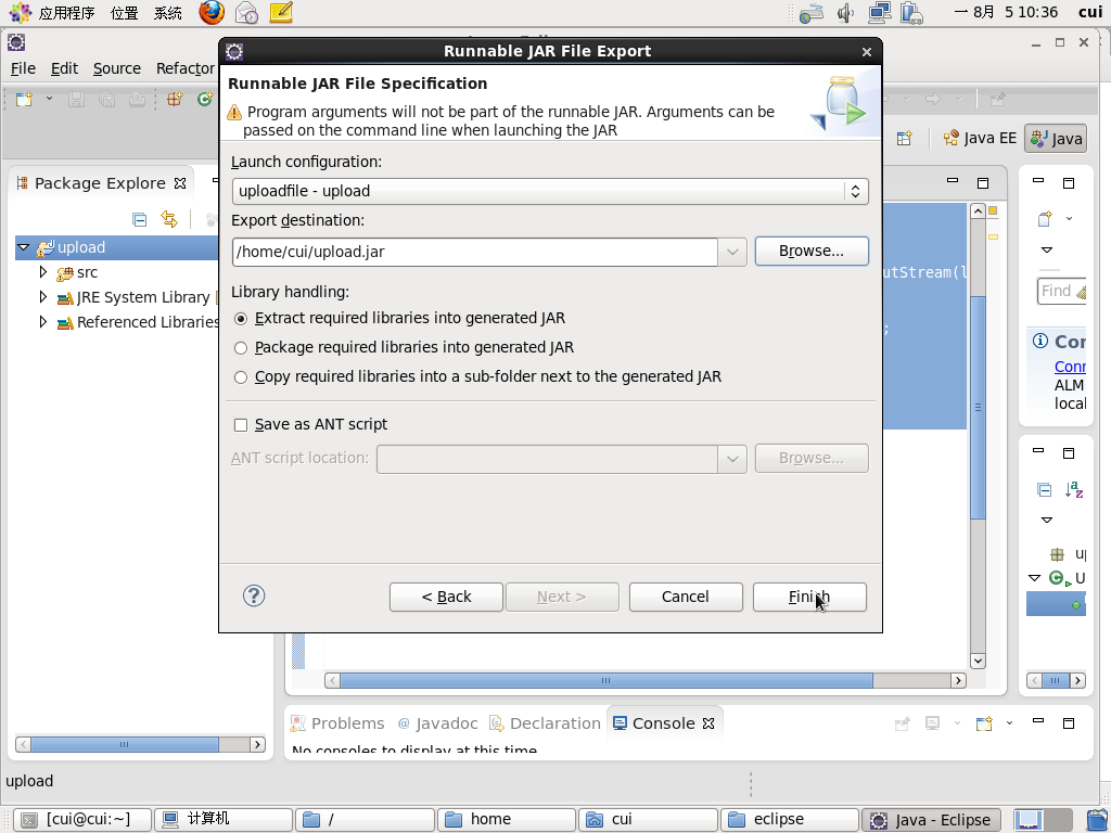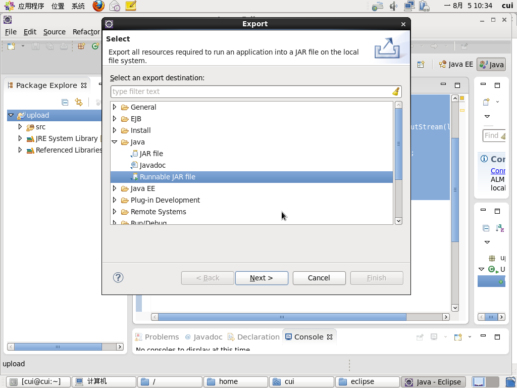 3. 選擇剛才的configuration uploadfile,選擇導出路徑/home/cui。命名為upload.jar
