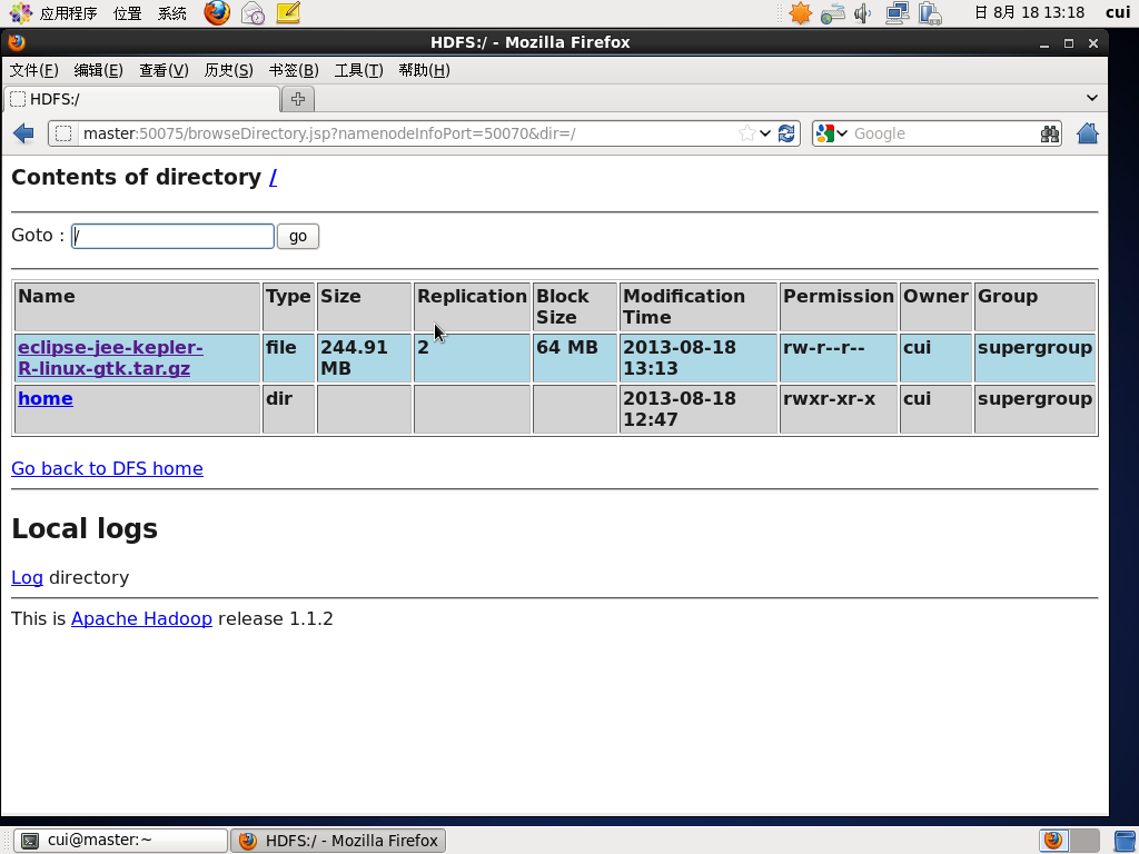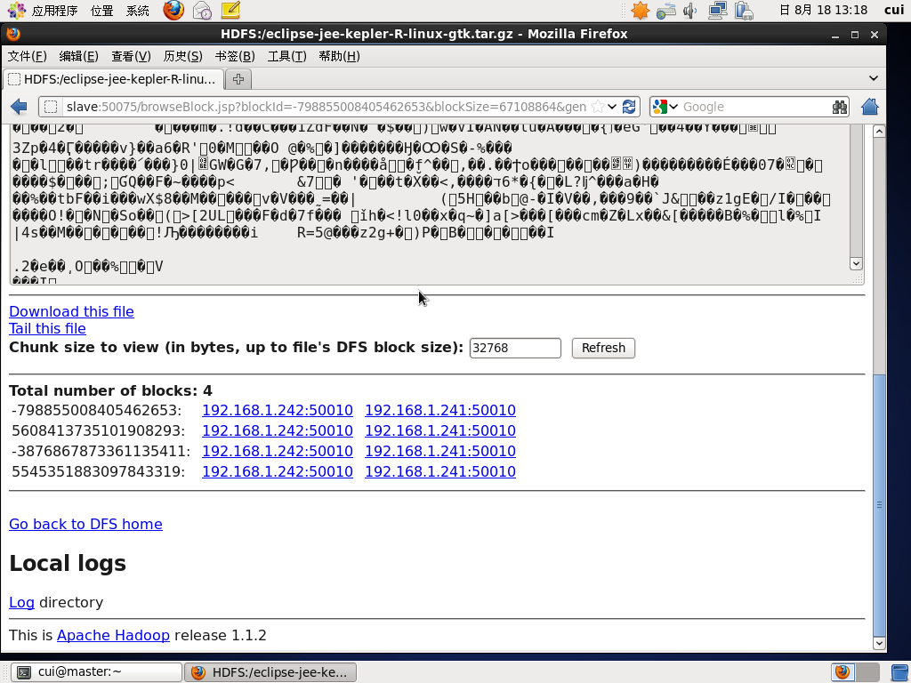 內容:想hadoop文件系統中上傳一個大文件,驗證文件分別分布在192.168.1.241節點和192.168.1.242節點上。