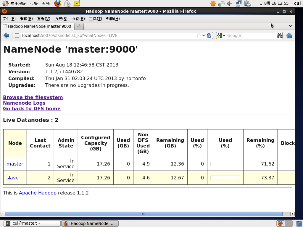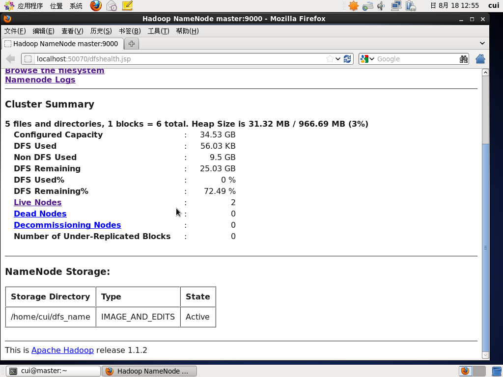 以上看到LiveNodes的個數為2,說明啟動成功。