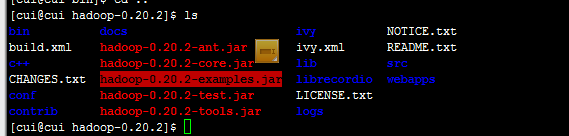回到Hadoop文件夾下,找到統計個數的jar包。如圖,在hadoop-0.20.2目錄下有一個hadoop-0.20.2-examples.jar。