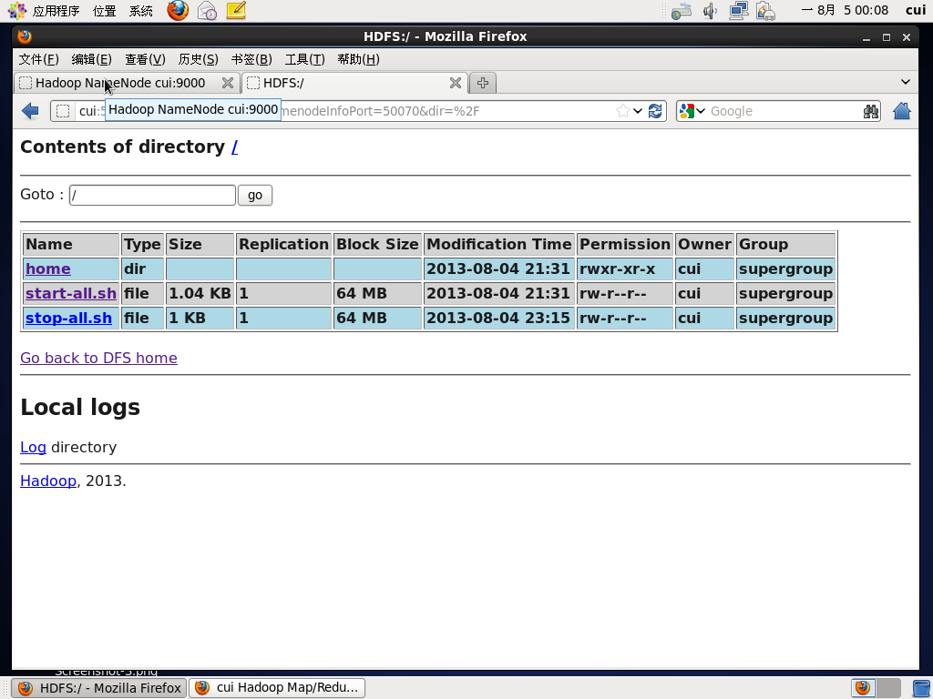 hdfs://cui:9000/ 表示存放在HDFS中的根目錄中。
