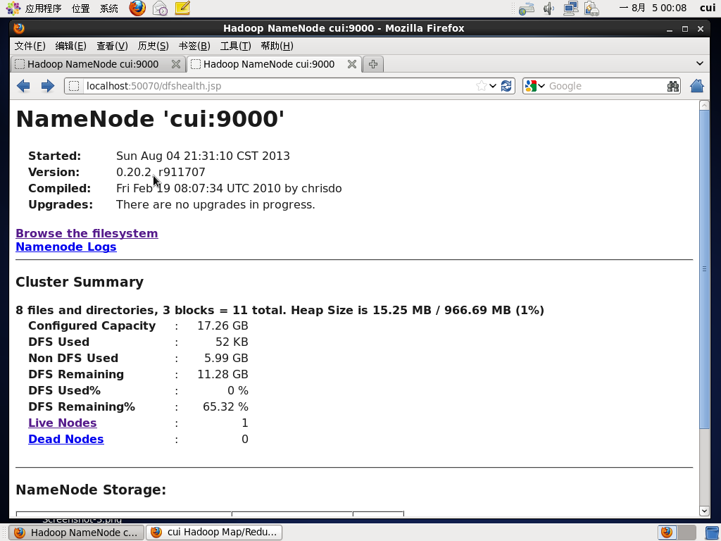 在瀏覽器中輸入:http://localhost:50070,打開頁面