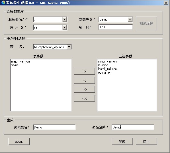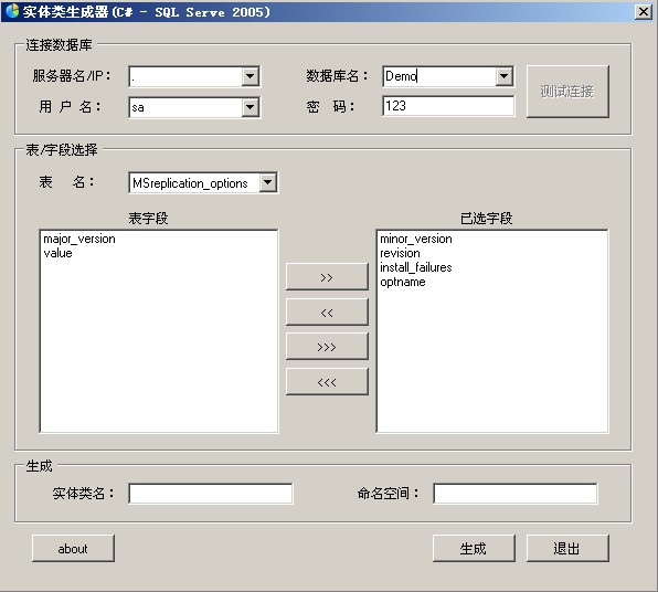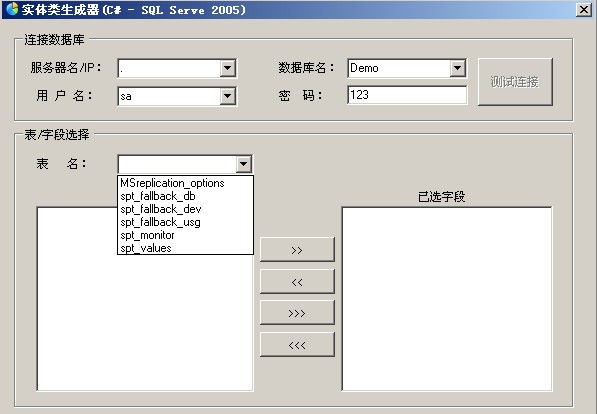四、選中表名下拉對話框中的任意表名,則程序自動將該表中所有的字段填充到左側ListBox中,此時,你可用選擇需要生成實體類的字段,并移動到右側的ListBox中。如圖(五)