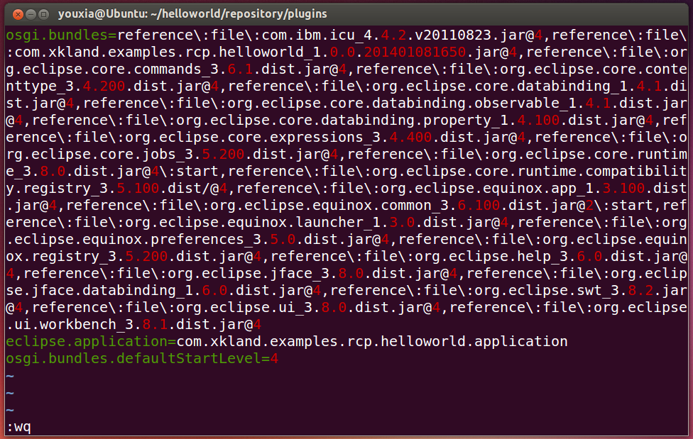 該文件定義了OSGi啟動(dòng)時(shí)安裝哪些Bundle,并且這些Bundle默認(rèn)的啟動(dòng)級(jí)別是多少。啟動(dòng)級(jí)別的數(shù)字越小的越優(yōu)先啟動(dòng)。configuration/config.ini是OSGi啟動(dòng)時(shí)默認(rèn)的配置文件路徑,當(dāng)然也可以使用-configuration選項(xiàng)更改為別的路徑。然后,如下命令啟動(dòng)HelloWorld: