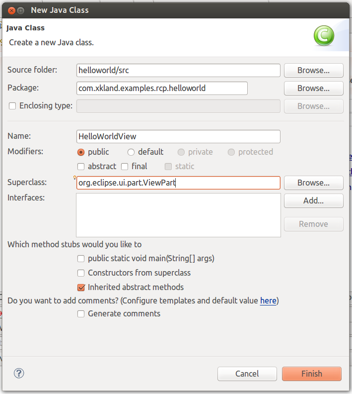 為了顯示Hello World,我們需要一個(gè)擴(kuò)展一個(gè)View。創(chuàng)建一個(gè)View類,其基類為org.eclipse.ui.part.ViewPart,如下圖: