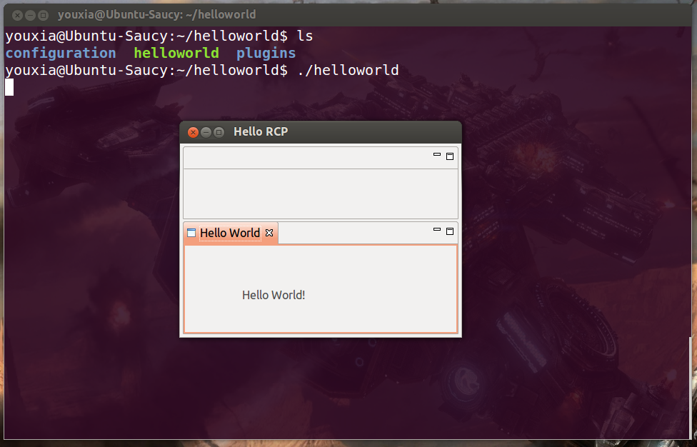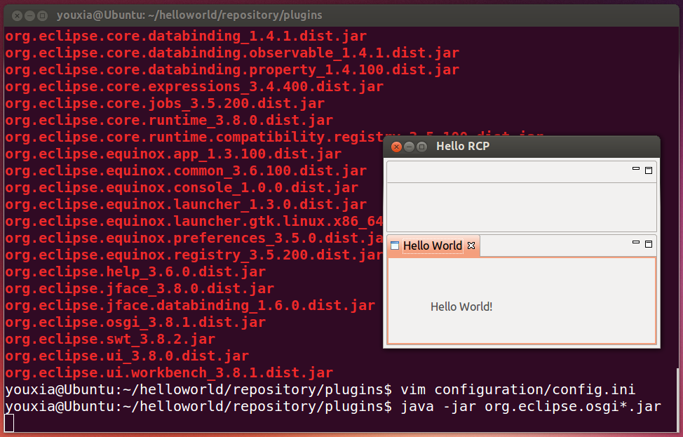好了,概念性的東西就將這么多。OSGi不需要深究,因?yàn)槲覀儠?huì)直接和Eclipse的Runtime打交道,以后會(huì)有專門(mén)的章節(jié)講Eclipse的Runtime提供有哪些服務(wù)。下面的例子演示即使不使用Native launcher,也可以通過(guò)OSGi框架啟動(dòng)我們的Hello World。