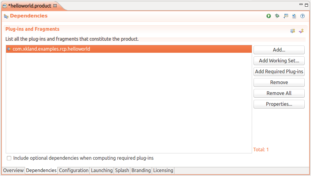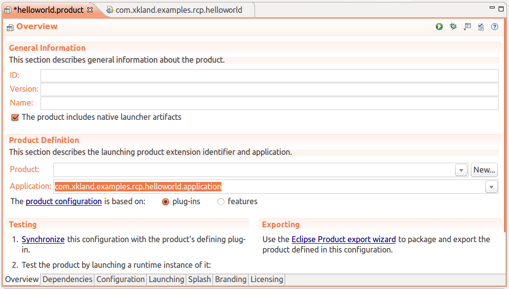到現(xiàn)在,我們的工作完成一半,因?yàn)樵摮绦蜻€只能在Eclipse中運(yùn)行,要想脫離Eclipse單獨(dú)運(yùn)行,必須將其作為單獨(dú)的產(chǎn)品導(dǎo)出。要導(dǎo)出產(chǎn)品,先要新建一個(gè)product configuration,然后進(jìn)行配置。為簡(jiǎn)單起見(jiàn),我們只需要配置三個(gè)地方。