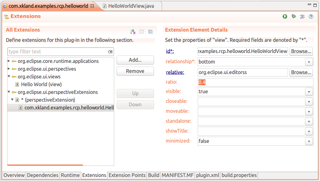 下一步,就要把這個(gè)HelloWorldView插入到窗口中,這個(gè)可以通過(guò)配置Plugin的Extension來(lái)實(shí)現(xiàn)。打開(kāi)plugin.xml的編輯器,增加一個(gè)org.eclipse.ui.views的擴(kuò)展,如下圖: