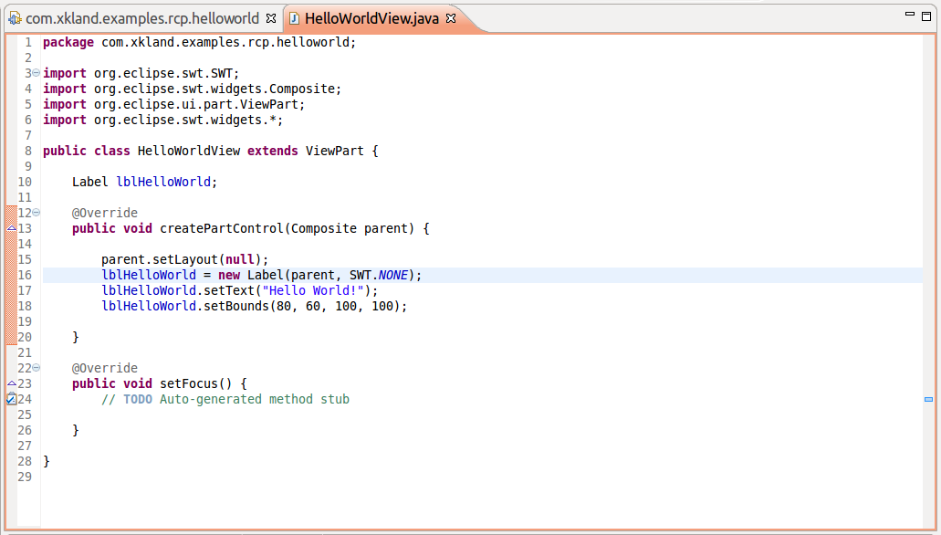 在HelloWorldView的代碼中,我們只需要一個(gè)SWT中的Label控件用來(lái)顯示HelloWorld,如下圖: