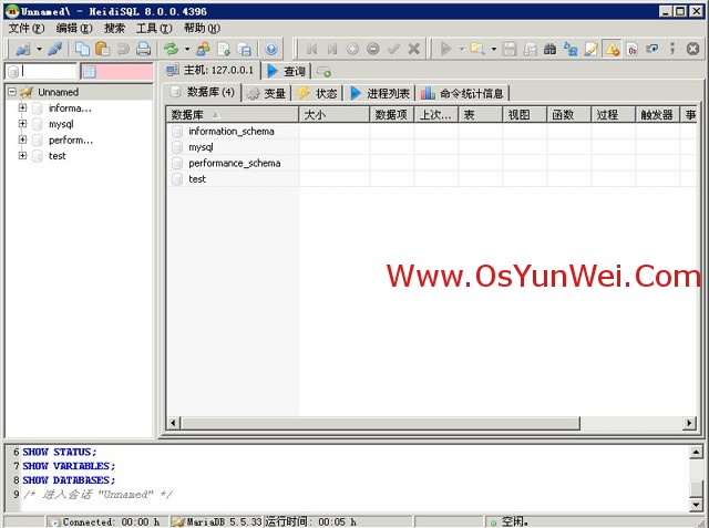 輸入root用戶密碼,點打開,如下圖所示,進入MariaDB管理界面
