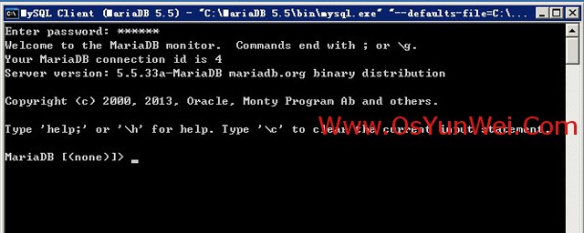 打開MySQL Client (MariaDB 5.5),輸入上面設置的root密碼登錄,如下圖所示