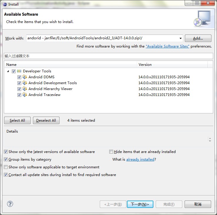在android.link中寫上path=E:/android/adt,目錄一直到解壓插件中的features和plugins目錄中的上一級即可