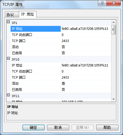 打開后展開Sql Server 網(wǎng)絡(luò)配置,找到相應(yīng)的數(shù)據(jù)庫版本啟用TCP/IP,雙擊TCP/IP修改里面所有端口為2433