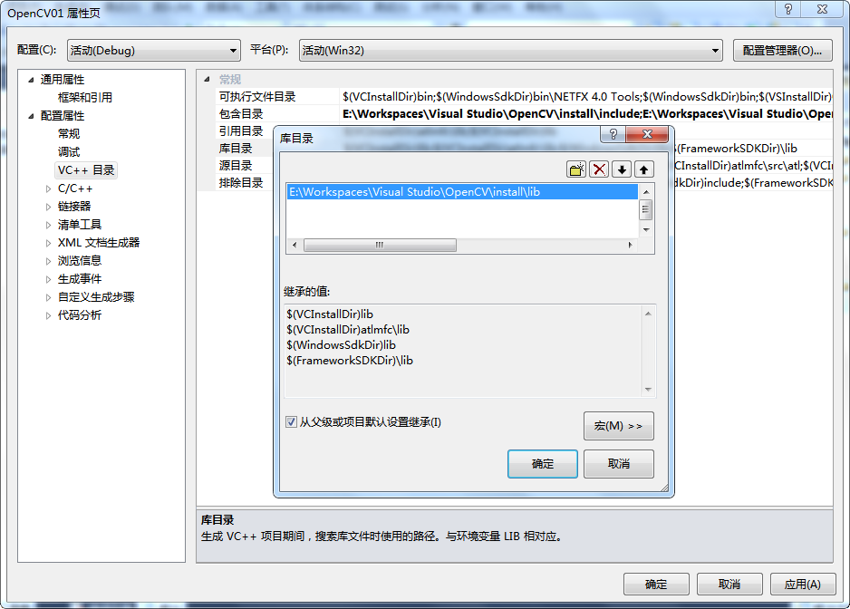 配置include路徑的作用是告訴VS從哪里查找OpenCV的頭文件,配置lib路徑的作用是告訴VS從哪里查找OpenCV的庫文件。