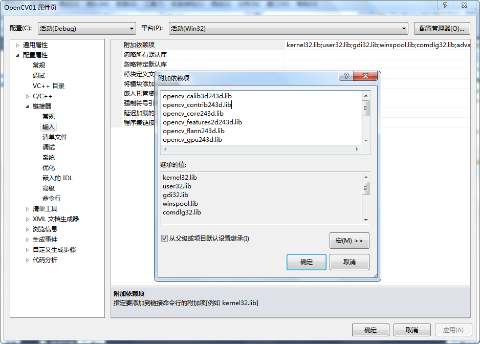 OpenCV世界的Hello World打開OpenCV01項目屬性,依次選擇“配置屬性”->“連接器”->“輸入”,為項目的Debug配置附加依賴項