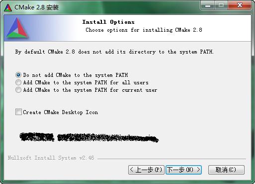 從http://www.cmake.org/cmake/resources/software.html上下載WWindows版本安裝包cmake-2.8.10.2-win32-x86.exe文件,雙擊一路默認安裝即可。