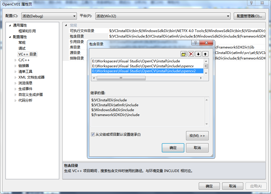2、打開OpenCV01項目屬性,依次選擇“配置屬性”->“VC++目錄”->“包含目錄”,添加相應路徑;
