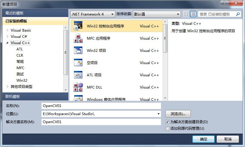 1、啟動VS2010,新建一個Win32控制臺應用程序OpenCV01;