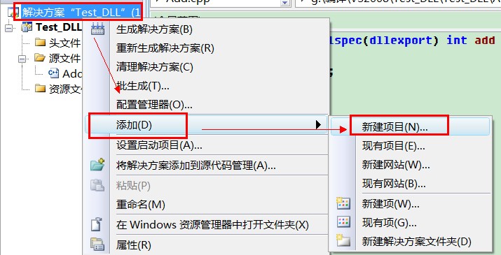 二:創建一個測試工程,為了測試和調試最方便,我們把直接在解決方案上,單擊鼠標右鍵-->添加-->新建項目