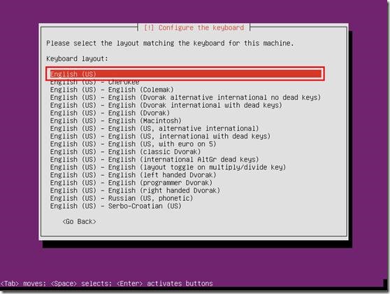 配置鍵盤,默認“No”,然后選英語鍵盤即可