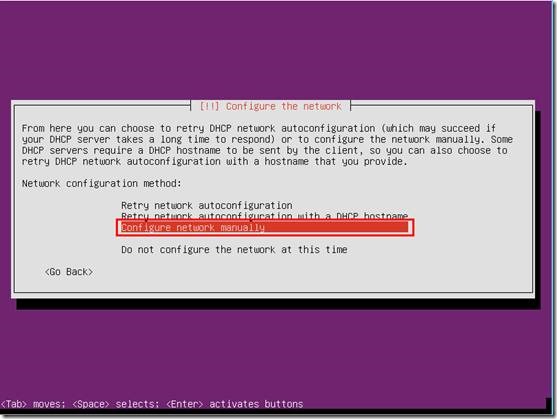 然后會開始安裝。。。顯示網絡自動配置失敗,進行手動配置即可