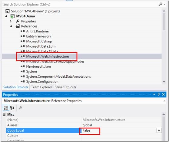 將“Microsoft.Web.Infrastructure.dll”的“Copy Local”設置為“False”