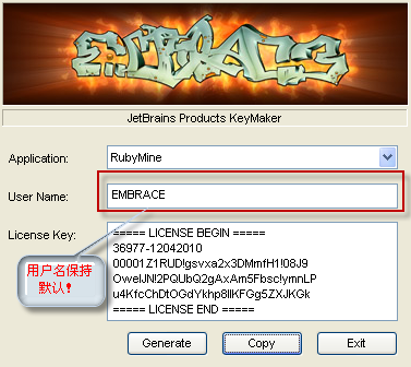 接下來會顯示“Enter JetBrains RubyMine License”對話框,要求License,這里該怎么做,中國人都明白!-_-|||,此處略去一個Key。。。