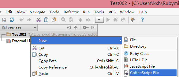 右鍵單擊工程,在右鍵菜單里選擇“New->CoffeeScript File”創建。