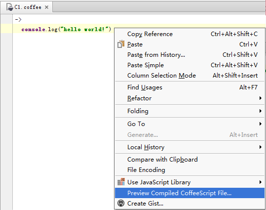 有了一個CoffeeScript源碼文件,寫點啥吧,那就來個“hello world!”,寫完后,右鍵代碼編輯區,在右鍵菜單里選擇“Preview Complied CoffeeScript File...”后,是不是看到了CoffeeScript代碼相對應的JavaScripte代碼了,有點意思。