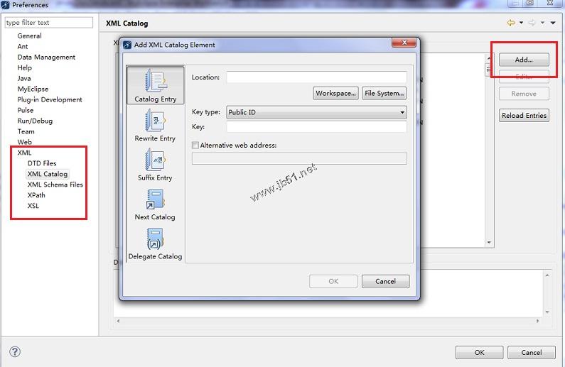 2、再打開的“Preferences”對話框中,選擇左邊的“XML”選項下的“XML Catalog”選項,然后選擇右邊的“Add”按鈕,打開如下的對話框,如圖所示:
