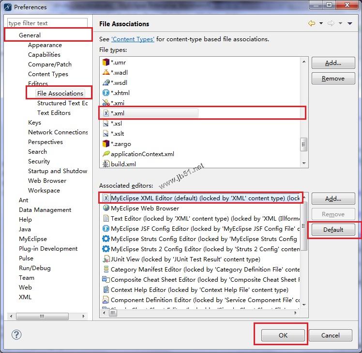 1、首先打開MyEclipse的窗口,選擇“Window”菜單下的“Preferences”選項,選擇“General”下的“File Associations”選項,在右邊的頁面中在“File types”里選擇“*.xml”,在下方的關聯編輯器處選擇“MyEclipse XML Editor”,單擊“default”按鈕將之設置為默認,單擊OK按鈕保存退出。如圖所示: