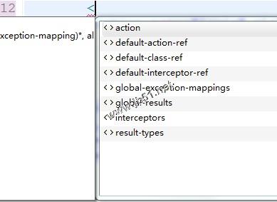 這樣當我們在struts.xml文件中輸入“<”便會出現提示了,如圖所示: