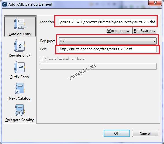 3、在打開的對話框中,在“location”中輸入struts.xml文件所對應的dtd文件的所在位置,最好不要選擇有中文的目錄,有時候正是因為選擇了中文目錄,所以沒有出現提示,選擇“File System”按鈕,找到dtd文件的位置,有人說解壓一個jar包,里邊有需要的dtd文件,其實只要我們下載了struts2的安裝包,在里面的某個文件夾里就有所需的dtd文件根本不用我們解壓,這里我的Struts2的目錄是我的電腦e盤根目錄下,在其中找到如下的路徑“E:/struts-2.3.4.1/src/core/src/main/resources”,在這個路徑下邊有一個“struts-2.3.dtd”的文件,這就是我們要找的文件,所以選中該文件之后,location的內容為:“E:/struts-2.3.4.1/src/core/src/main/resources/struts-2.3.dtd”,接下來在“Key type”的地方選擇類型為“URI”,在“Key”的地方輸入“E:/struts-2.3.4.1/src/core/src/main/resources/struts-2.3.dtd”,這句話可以上該dtd文件DOCTYPE中找到。如圖所示: