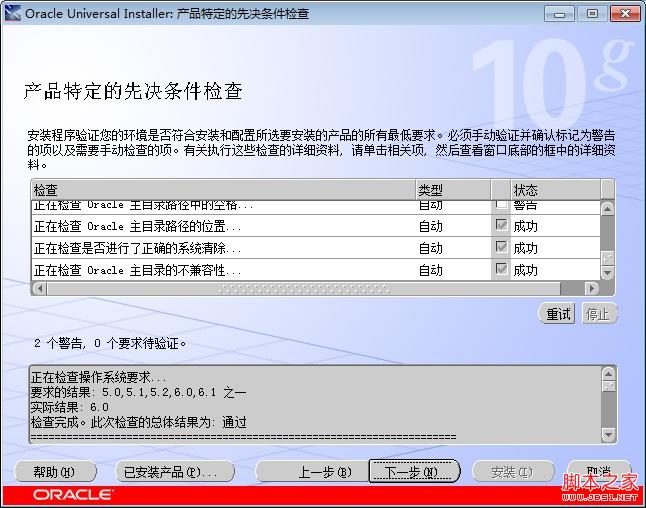 3、可以看到準(zhǔn)備安裝框,等待一會兒出現(xiàn)有關(guān)“產(chǎn)品特定的先決條件檢查”的對話框,由于我第一次安裝失敗,下邊的這個圖是我第一次截的圖,第二次忘了截了,出現(xiàn)了兩個警告,這也導(dǎo)致了我后邊的失敗,第二次安裝成功了,原因在于我添加了網(wǎng)絡(luò)適配器和取消了Oracle的安裝目錄中的空格,所以大家最好不要讓他出現(xiàn)警告。單擊下一步繼續(xù)。如圖所示: