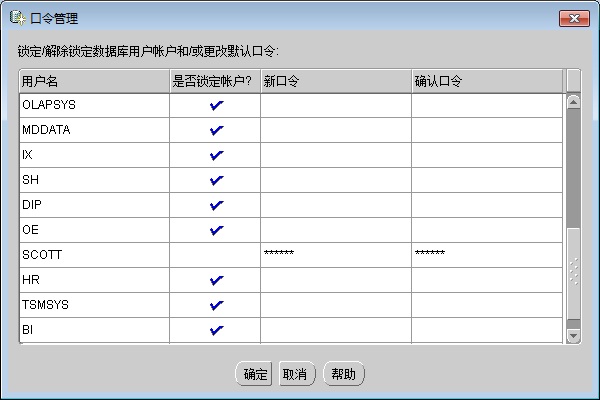 我們要解鎖SCOTT這個用戶,將它的口令設(shè)置為“tiger”(即老虎的意思)。單擊兩次確定的按鈕返回。