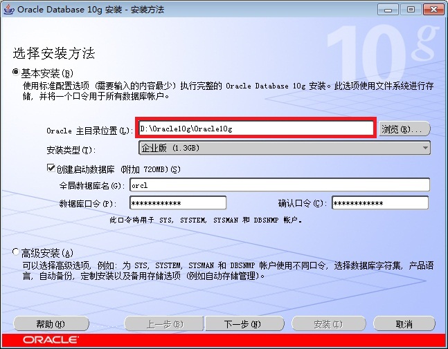 2、接下來便出現(xiàn)了“Oracle Datebase 10g 安裝-安裝方法”的對話框,在該對話框中,設(shè)置Oracle的主目錄的位置,對于Oracle的主目錄的位置最好設(shè)置為兩層的目錄結(jié)構(gòu),且主目錄的的文件名不要有空格,否則到后面檢查的時候會出現(xiàn)警告,在到后面會安裝失敗。所以在這里選擇它的安裝目錄為“D:/Oracle10g/Oracle10g”,并設(shè)置數(shù)據(jù)庫的口令。單擊下一步,如圖所示: