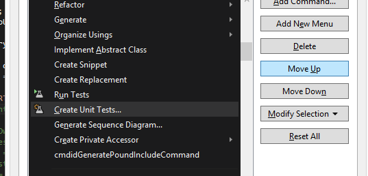 3. 這是我們可以看到久違的Create Unit Tests…菜單,選擇后點擊Move Up或Move Down,讓這個菜單移動到Run Tests周圍即可(這點需要注意,如果移動后還未看到菜單出現在右鍵菜單中,那么再移動一次,直到該菜單出現為止):