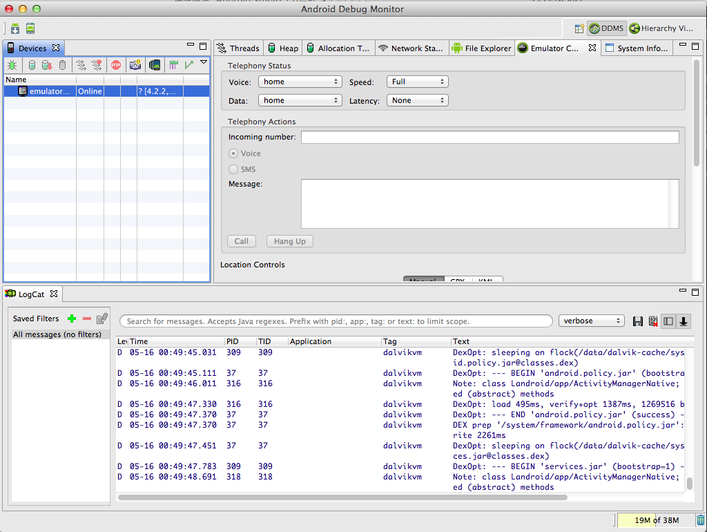 然后重新嘗試,又起來了。DDMS的樣子,和Eclipse上的一樣。