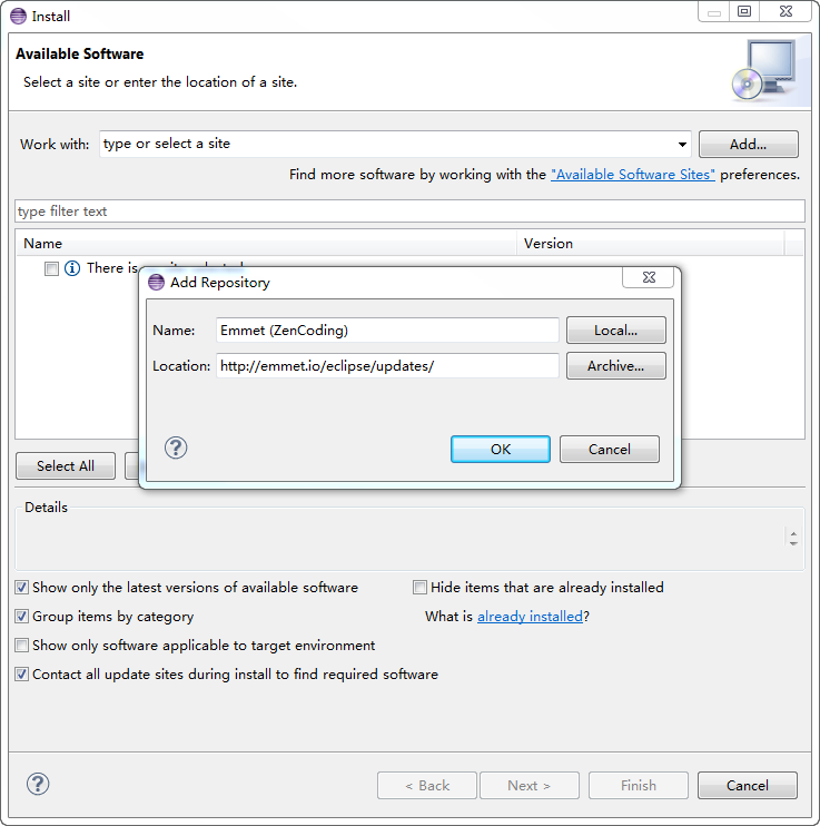 在彈出的對話框的 Location 一欄輸入 http://emmet.io/eclipse/updates/ ,在 Name 一欄隨便輸入一個名字,比如 Emmet,單擊 OK: