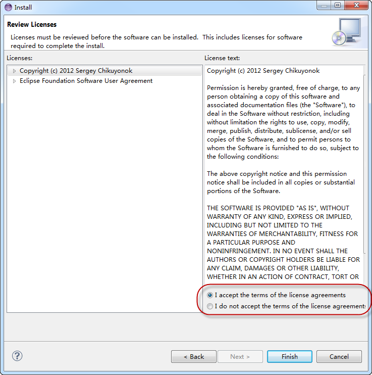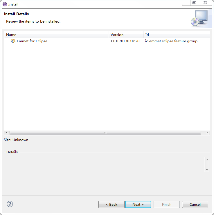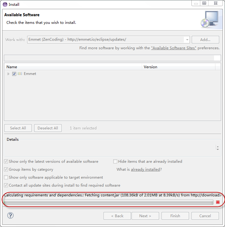 當 Install 對話框中顯示出了 Emmet 選擇項后,選擇 Emmet,一路 Next,到最后一步,選擇 I accept the terms of th license agreements,單擊 Finish,彈出下載對話框,開始下載必要的組件: