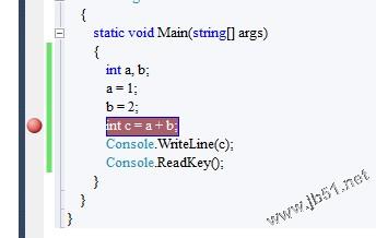 2、 打斷點,也就是在你覺得可能出錯的地方打上斷點,程序到那就會暫停,我們在按F11,進行調試,這樣可以方便的找出出錯的地方進行修改。打斷點:鼠標指向你要打斷點的那行的左邊,然后點擊即可,再點擊即取消,如圖: