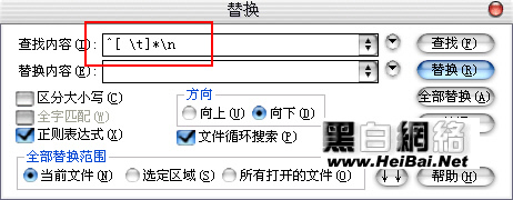1.選擇“搜索”菜單的“替換”命令,出現如圖所示的文本替換對話框。選中“正則表達式”復選框,表明我們要在查找、替換中使用正則表達式。然后,選中“全部替換范圍”中的“當前文件”,表明對當前文件操作。(提示:可以同時打開多個文件進行操作,只要選中“所有打開的文件”)。