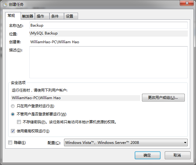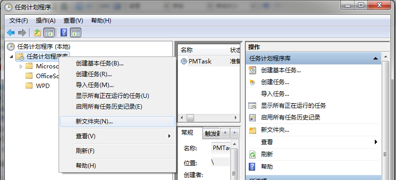 然后,進入文件夾,在其中創建任務,選擇右邊的創建任務。注意在彈出的對話框中,選中 “不管用戶是否登陸都要執行”, 和使用最高權限執行。