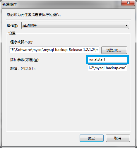 在操作中,選擇新建操作,注意,在添加參數中,一定要加上 runatstart