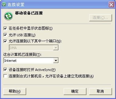 1、打開Windows Mobile 設備中心,點擊“移動設備設置/連接設置”,在“允許連接到以下任一個端口(N)”下選擇“DMA”。