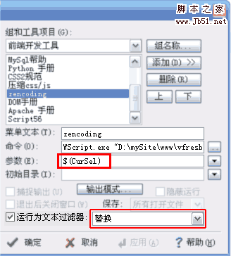 在EditPlus中依次點擊[工具(T)]->[配置用戶工具(C)]->[添加(D)]->[應用程序]設置如下:(請將命令修改為你的zencoding插件路徑)然后設置一個自己喜歡的快捷鍵吧。