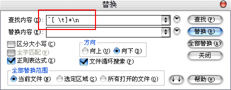 1.選擇“搜索”菜單的“替換”命令,出現(xiàn)如圖所示的文本替換對(duì)話框。選中“正則表達(dá)式”復(fù)選框,表明我們要在查找、替換中使用正則表達(dá)式。然后,選中“全部替換范圍”中的“當(dāng)前文件”,表明對(duì)當(dāng)前文件操作。(提示:可以同時(shí)打開多個(gè)文件進(jìn)行操作,只要選中“所有打開的文件”)。