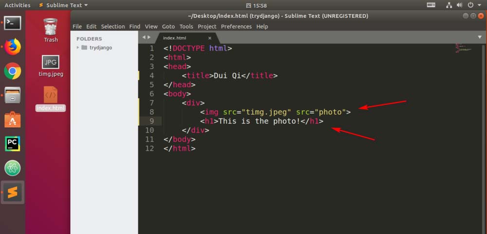 4、然后用img這個標簽就可以插入圖片了,src里面寫入圖片的文件名字。文字自己定義。